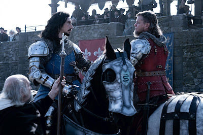 Para "El último duelo", además, se marca un espléndido "Rashomon" (para que me entiendan fácilmente los cinéfilos avezados), tres versiones personales para ilustrar desde distintos puntos de vista el proceso en el que en la Francia de finales del siglo XIV el caballero Jean de Carrouges (Matt Damon) acusó a Jacques Le Gris (Adam Driver), favorito del conde Pierre d'Alençon (Ben Affleck), de haber forzado a su esposa Marguerite de Carrouges (Jodie Comer): J'accuse…!. Tres testimonios diferentes, tres defensas propias, tres acusaciones ajenas, cada una exhibiendo pequeños cambios, mínimos matices que pueden ser trascendentales y que configuran un relato por triplicado para que el juicio de Dios, que es cada uno de los espectadores que contemplan la película, decida invariablemente a qué campeón fortalecer el brazo para sentenciar la condena bárbara, pero certera, que esperaban aquellos tiempos salvajes.